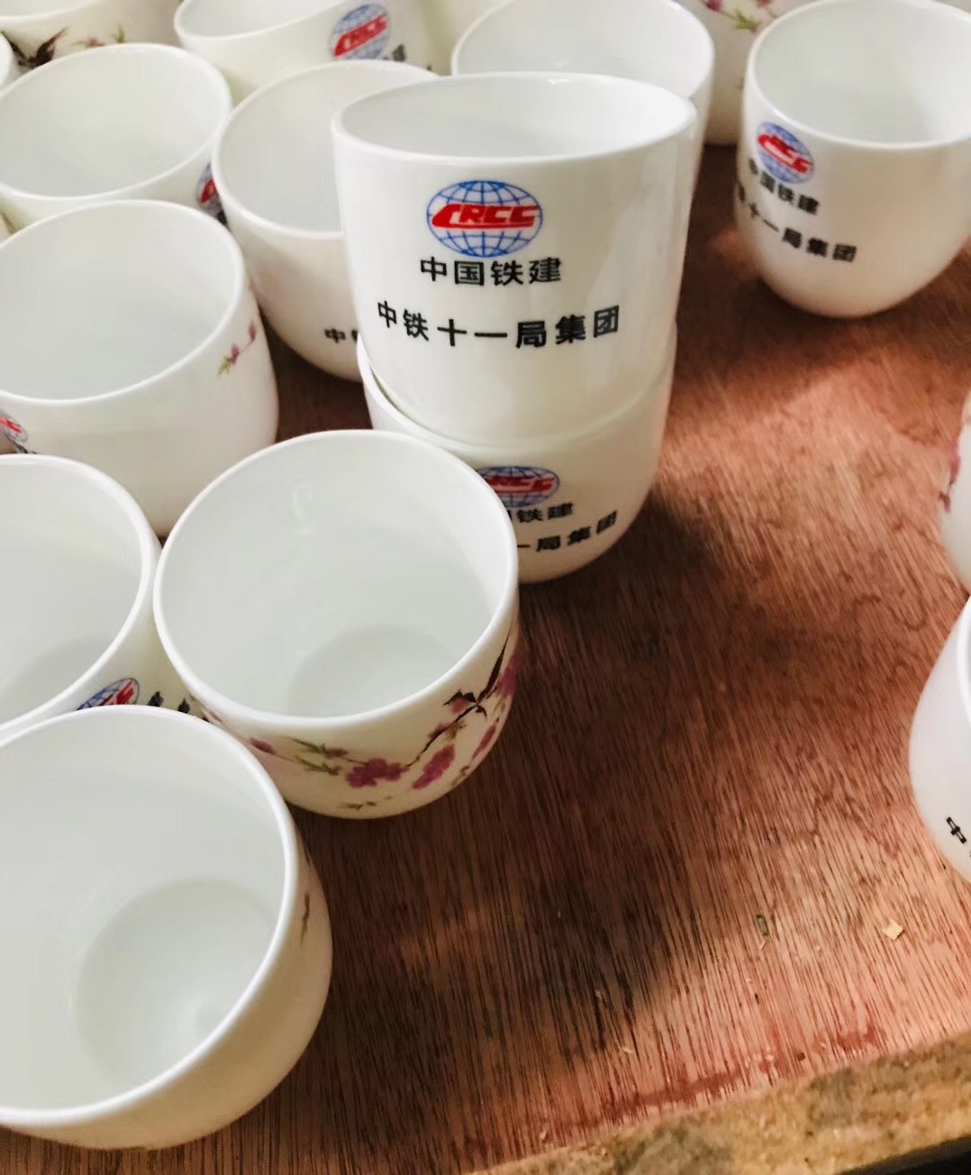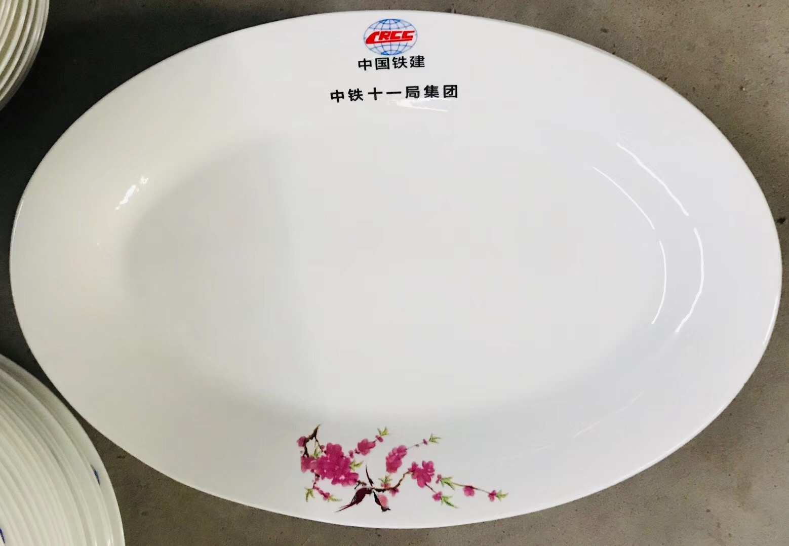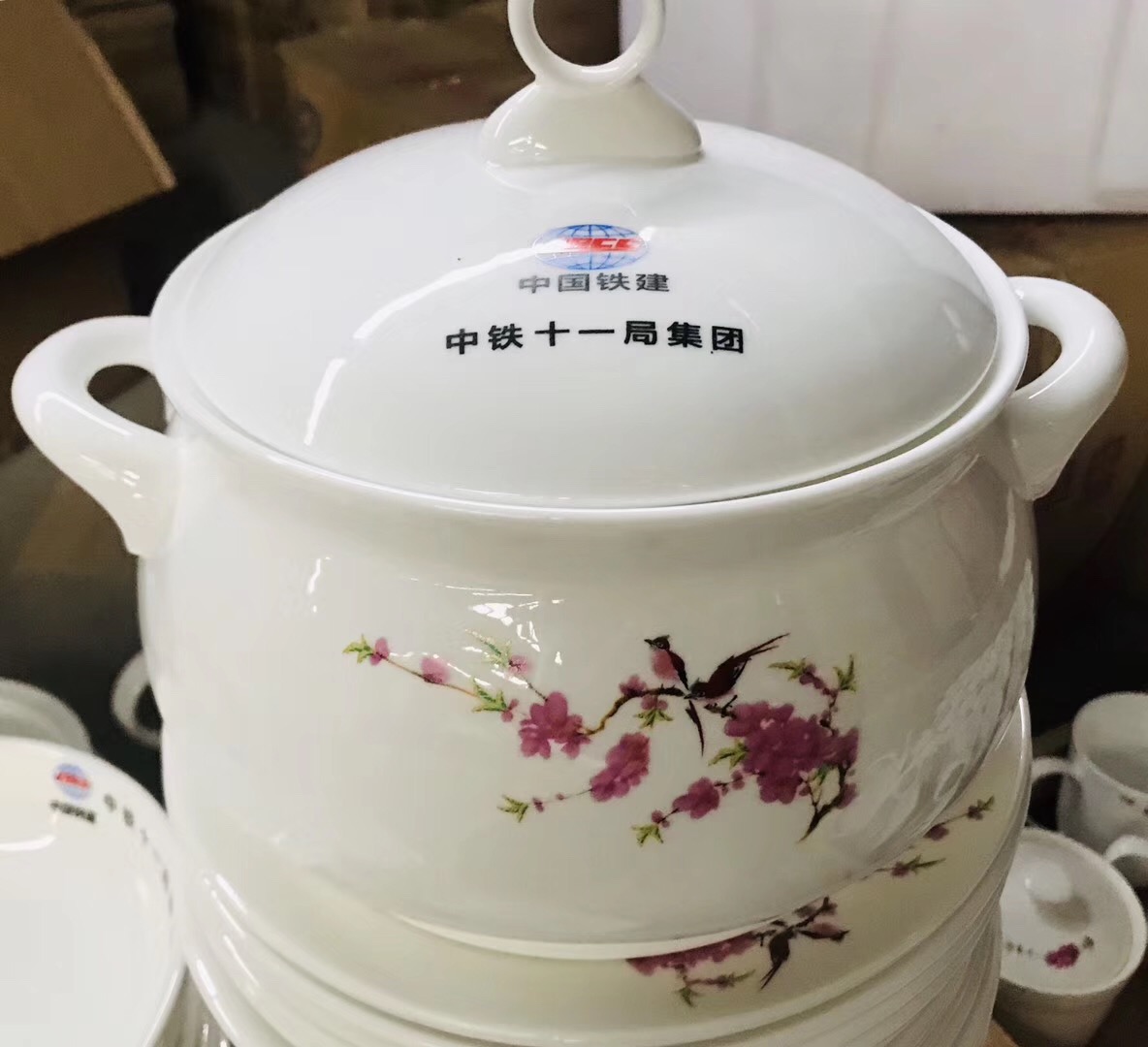 ,這次定製的餐具圖案一支梅花,畫麵中鐵十一局商標,產品有魚盤,深盤,煲,碗,小蝶,杯子,定製的